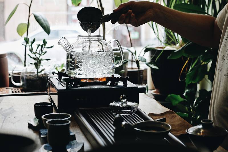 9. Когда появятся первые маленькие пузырьки — выливаем отлитую в чахай воду обратно в чайник. Этот процесс называется «омолаживание» воды.