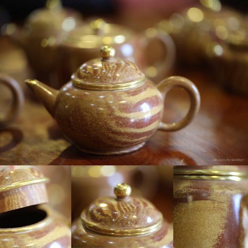 Помимо замечательных интересных чайников, выполненных в различных техниках, приехали чайники, совмещающие в себе сразу три оригинальных технологии - сырье "тяо ни" (смешанная глина, в данном случае - это дуань ни и цзы ни), полировка внешней поверхности до блеска, и украшение золотом!